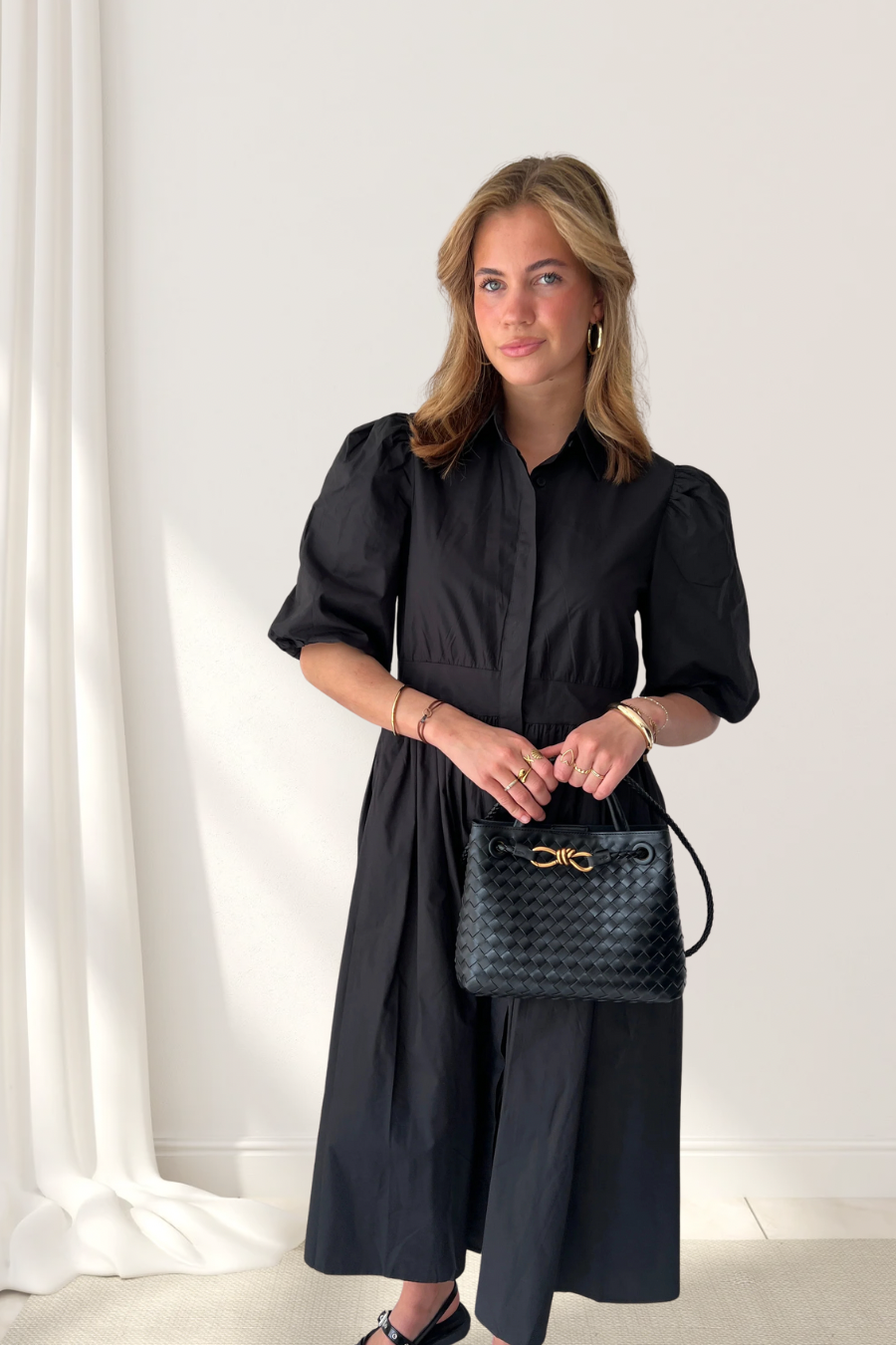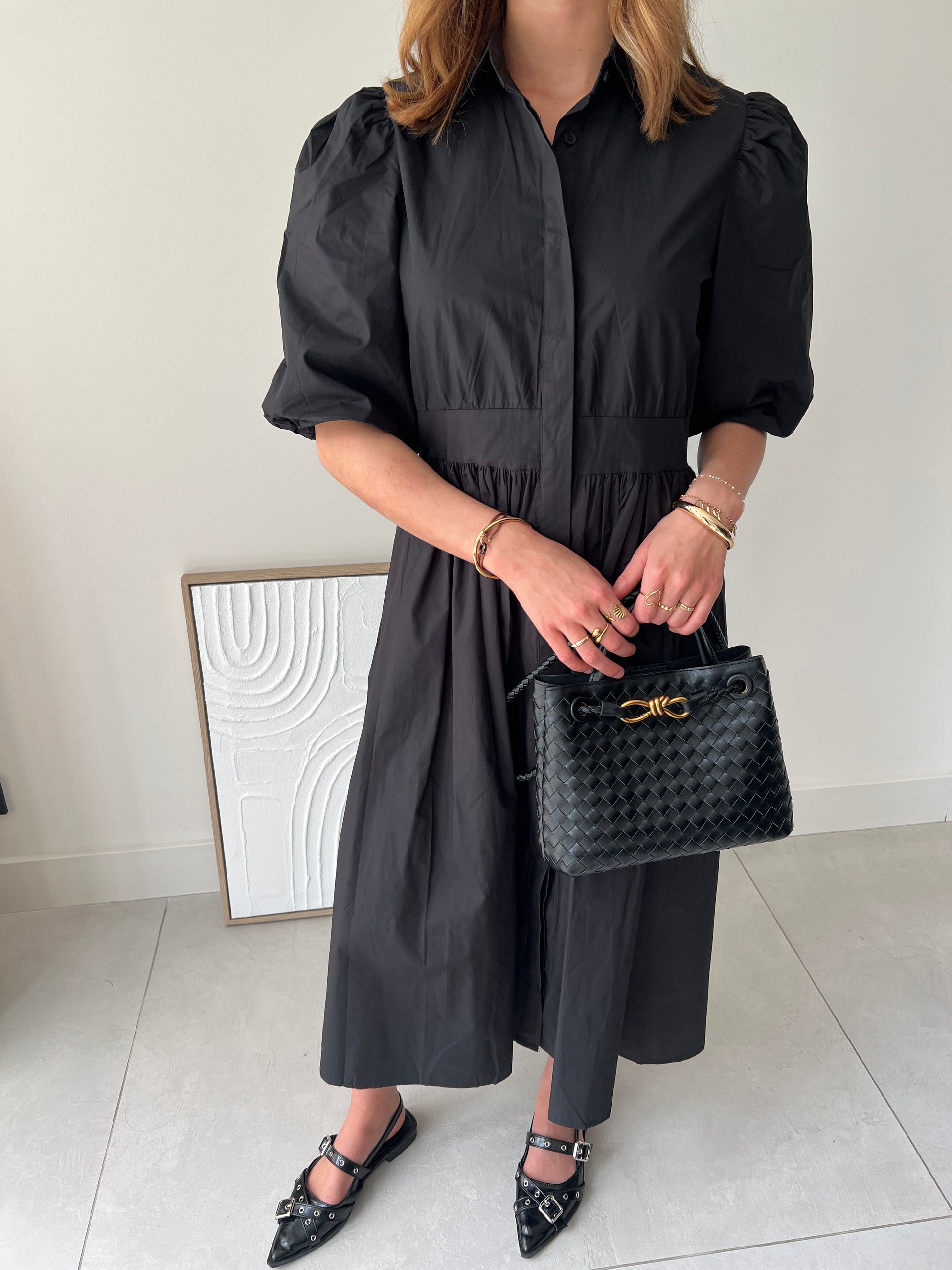 Ontdek de kracht van eenvoud met deze prachtige zwarte blousejurk van 100% katoen. Deze middellange jurk combineert een klassieke uitstraling met vrouwelijke details die je silhouet flatteren.