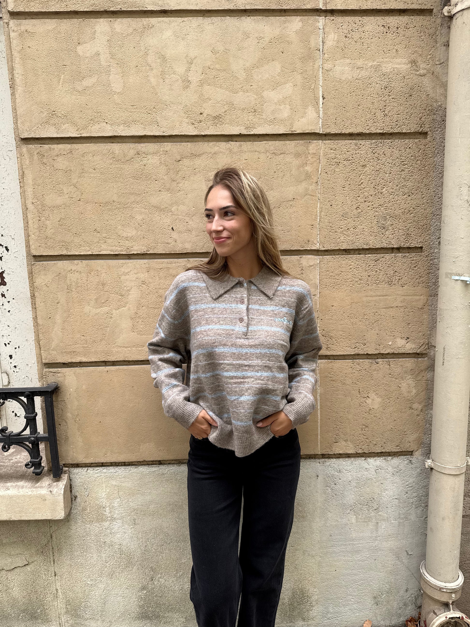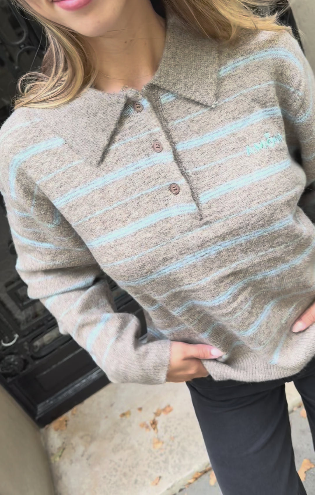 De Paris Amour Pully is een oversized trui met streepjes en het subtiele “Amour”-detail op de borst. Verkrijgbaar in donkerblauw met rode streepjes en taupe met lichtblauwe streepjes.